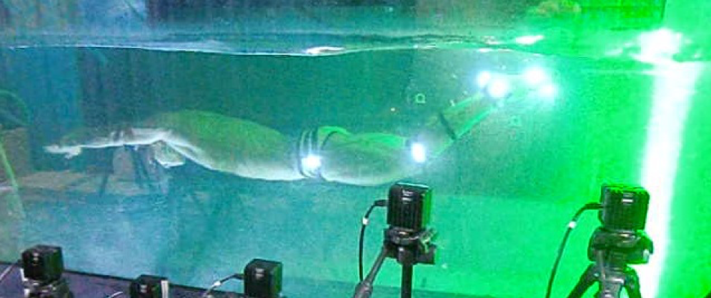 筑波大学体育系 高木英樹教授、新潟医療福祉大学健康科学部 下門洋文講師らの研究グループは、筑波大学が保有する実験用回流水槽を用いて、キック泳中のスイマーの三次元動作解析とスイマーの周りの流れの三次元的可視化を同時に行い、その推進メカニズム解明に取り組みました。