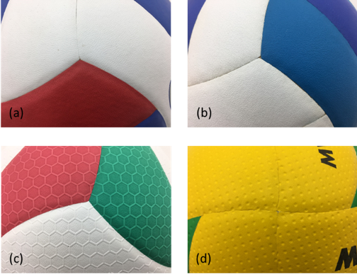 図 本実験で使用した現代バレーボールの表面形状 (a)Adidasボール,(b)Mizunoボール,(c)Moltenボール(六角形),(d)Mikasaボール(ディンプル形) (a)と(b)は従来のバレーボール、(c)と(d)は新バレーボール