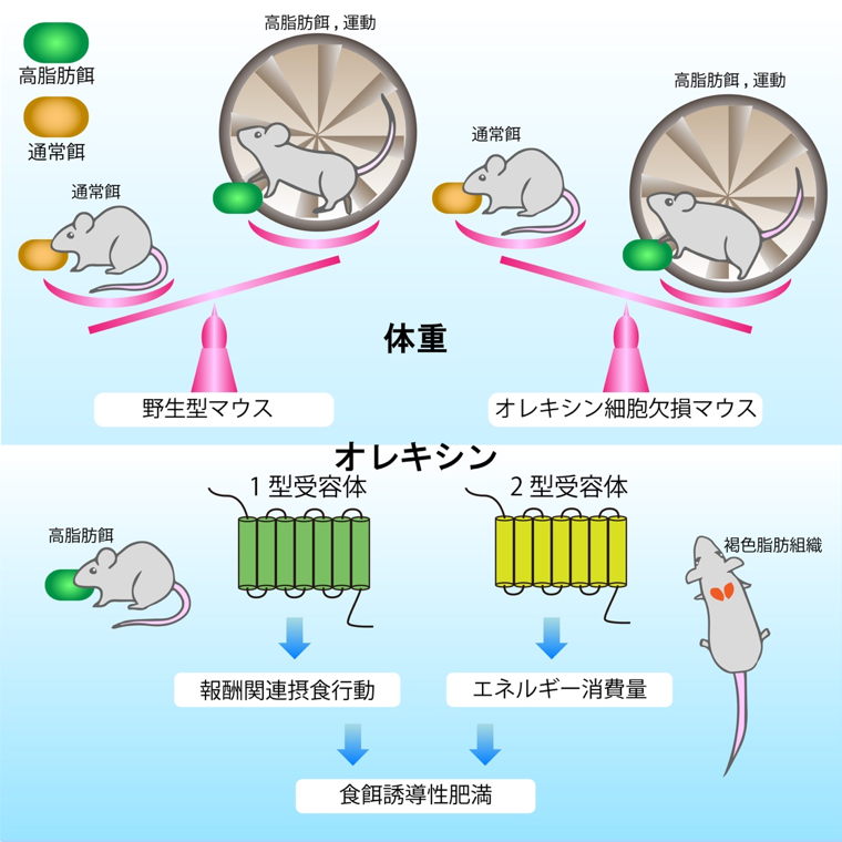 オレキシンは脳の視床下部で作られる神経ペプチドであり、睡眠、摂食、エネルギー産生の制御に関与します。本研究では、野生型マウスを回転ホイールのあるケージで飼育すると、高脂肪餌によって肥満しにくいにもかかわらず、オレキシン神経のないマウスは同様の環境であっても肥満することから、オレキシン神経が、運動と食餌摂取を介してマウスを太りにくくしていることが明らかになりました。さらに、オレキシン受容体を欠損したマウスを調べて、オレキシン1型受容体は報酬価の高い食餌摂取の促進を、オレキシン2型受容体はエネルギー消費の促進を担っていることを明らかにしました。本研究成果は、抗肥満薬の開発のほか、運動と食事を通した健康なライフスタイルの確立に貢献すると期待されます。