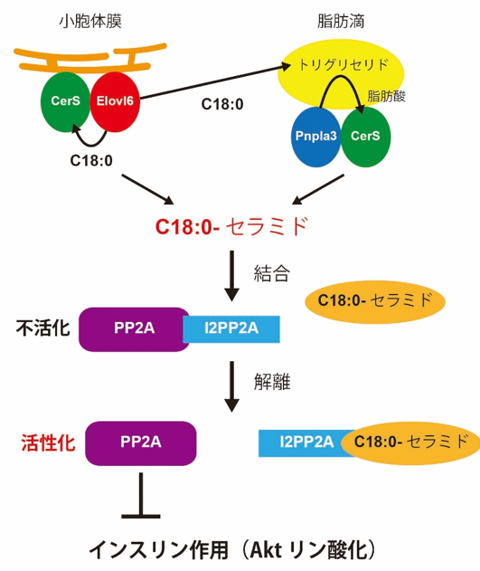 炭水化物の過剰摂取や血液中のインスリン値の上昇は肝臓の脂肪酸合成を活性化し、Elovl6とPnpla3の発現を増加させる。Elovl6の発現の増加はステアリン酸(C18:0)の合成を促進する。小胞体膜上では、Elovl6により合成されたステアリン酸(C18:0)はセラミド合成酵素(ceramide synthase: CerS, セラミドに含まれる脂肪酸の種類を決定する酵素)によってセラミドに組み込まれ、C18:0-セラミドが合成される。Elovl6により合成されたステアリン酸(C18:0)は、中性脂肪(トリグリセリド)として脂肪滴にも貯えられる。脂肪滴では、Pnpla3により中性脂肪から切り出された脂肪酸がセラミド合成酵素によってセラミドに組み込まれ、C18:0-セラミドが合成される。このようにして脂肪酸合成が活性化した肝臓で増加したC18:0-セラミドは、脱リン酸化酵素プロテインホスファターゼ2A(protein phosphatase 2A: PP2A)の内因性の阻害因子であるI2PP2A(Inhibitor 2 of PP2A)に結合し、I2PP2AをPP2Aから解離させることにより、PP2Aを活性化させる。活性化したPP2Aはインスリンシグナルの主要なシグナル伝達因子であるAktの活性化(リン酸化)を阻害することで、インスリン作用を低下させる。肝臓におけるElovl6の阻害はC18:0-セラミドを減少させることによりインスリン作用を亢進させる。