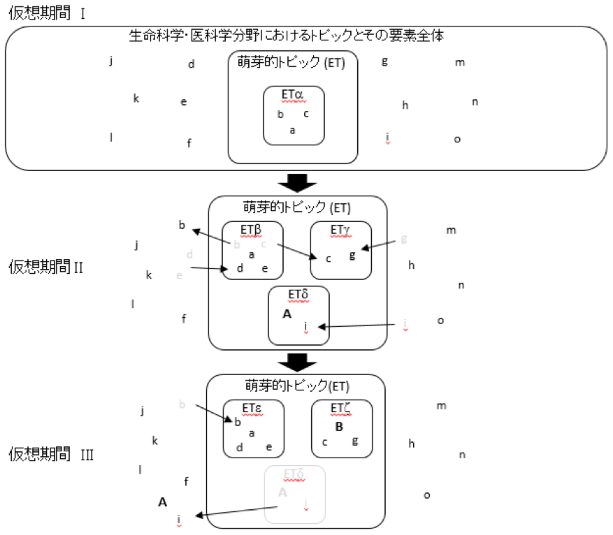 それぞれの萌芽的トピックは、様々な要素(現象、疾患、プロセス、物質名、遺伝子、生物種、解剖学的部位、技術、デバイスなど)から構成されています(例えば、期間Iの萌芽トピックETαは、要素a, b, cから構成されています)。それぞれの期間で、萌芽的トピックと萌芽的トピックを構成する要素は限られています(全体の1割程度)。萌芽的トピックは、要素を取り込んだり、放出することで、新しい萌芽的トピックとなっていきます。例えば、仮想期間Iの萌芽的トピックETαは、要素bとcを放出し、要素dとeを新たに取り込むことで、仮想期間IIに新たな萌芽的トピックETβとなります。放出された要素cは新たに要素gを取り込むことで、仮想期間IIに萌芽的トピックETγを創出します。仮想期間IIにおいては、突如新たに登場した要素Aが、要素iを取り組んで新たな萌芽トピックETδを創出します(ノーベル賞級のトピックの場合、このパターンが多い)。萌芽的期間を過ぎて成熟・定着したトピックは萌芽的でなくなります。仮想期間IIにおけるETδは仮想期間IIIにおいては、成熟・定着し、もはや萌芽的トピックではありません。萌芽的トピックの要素が再度萌芽的トピックの創出に関わることも多く、例えば、仮想期間IIのETβは仮想期間IIIにおいて要素bを再度取り込み、新たな萌芽的トピックETεとなります。萌芽的トピック研究の進展に伴い、突如新たな要素が表れて、新たな萌芽的トピックを創出することもあります。例えば、仮想期間IIの萌芽的トピックETγは、仮想期間IIIにおいて、突如要素Bを生み出し、新たな萌芽的トピックETζとなります。多くの研究要素(図中のf, h, j, k, l, m, n, o)は、萌芽的トピック創出に関与しません。