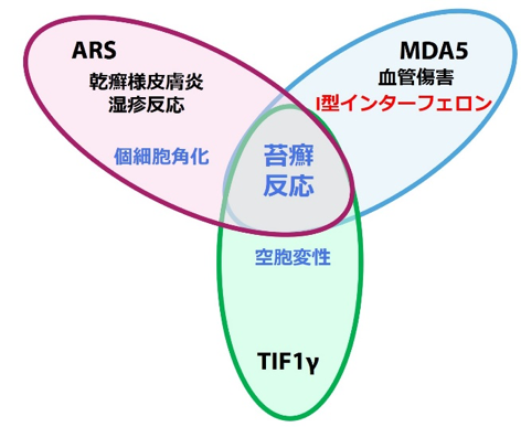 抗ARS抗体陽性例では、角化性で、しばしば乾癬や湿疹と誤診される皮疹であることが、病理組織学的にも示唆されます。また、内出血様の暗紅色斑が特徴である抗MDA5抗体は、やはり病理組織でも血管傷害が強く認められました。抗TIF1γ抗体陽性例では、重篤な皮疹がびらん化することがありますが、これは苔癬反応の空胞変性(細胞障害の一種)が引き起こしているものと考えられます。 さらには、I型インターフェロンは、抗MDA5抗体陽性例の病態には関与していると考えられるものの、抗ARS抗体陽性例では関与が見られないことが示唆されました。