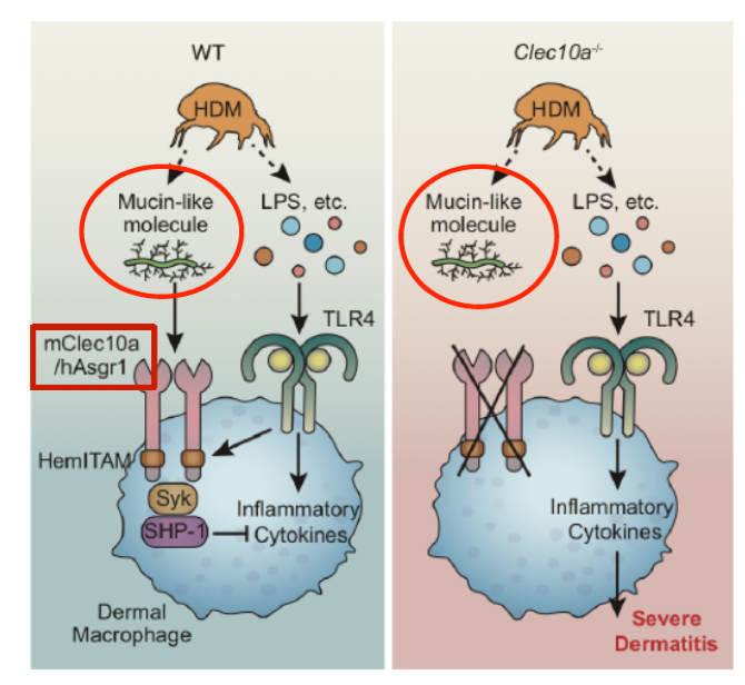 図 野生型マウス(WT)では、ダニの成分であるLPS(エンドトキシン)が皮膚のマクロファージを刺激し、アトピー性皮膚炎を誘導するのに対し、別のダニの成分であるムチン様分子がClec10a(Asgr1)を介して、これを抑制している(左)。NC/NgaマウスやClec10遺伝子欠損マウス(Clec10a-/-)では、Clec10aの発現がないために、LPSの刺激に対する抑制が効かず、アトピー性皮膚炎の症状が強く起きる(右)。