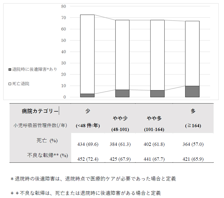 その結果、重症小児治療経験の多い病院(人工呼吸器管理件数が週に約3件以上)では、少ない病院(週に約1件未満)に比べて、死亡退院の相対リスク(調整後オッズ比)が約0.5倍であることが示されました。