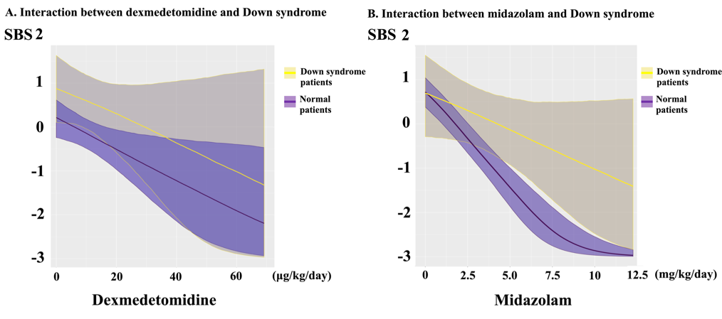 紫線は非ダウン症患児、黄色線はダウン症患児を表す。横軸は薬剤の投与量、縦軸は鎮静スケールSBSによる鎮静状態を示し、数値が低いほど深い鎮静状態であることを意味する。左図のデクスメデトミジンでは、紫の線(非ダウン症患児)と黄色の線(ダウン症患児)の鎮静状態は平行に推移しており、鎮静作用の差は観測されない。一方、右図のミダゾラムでは、薬剤の用量を増やすにつれて、非ダウン症患児は鎮静が深くなるのに対し、ダウン症患児は非ダウン症患児ほど鎮静が深くなっていないことが観察された。