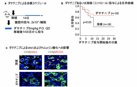 図 ダサチニブにより、濾胞性ヘルパーT細胞リンパ腫の実験モデルマウスの生存が延長した