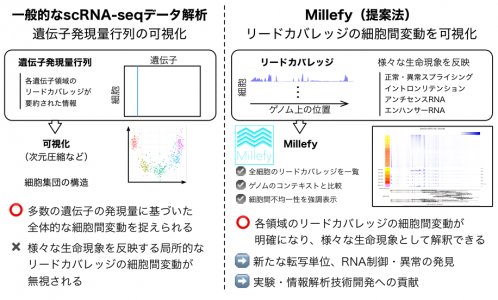 筑波大学 医学医療系・人工知能科学センターの尾崎遼准教授、国立研究開発法人理化学研究所 生命機能科学研究センターの二階堂愛チームリーダーらの研究グループは、1細胞RNAシーケンス法(1細胞RNA-seq)データのリードカバレッジの細胞間変動(細胞ごとのばらつき)を可視化するソフトウェア「Millefy(ミルフィー)」を開発しました。
