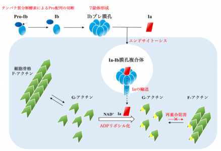 ウェルシュ菌から産生された膜結合成分Ibは膜孔を形成し、酵素成分Iaを細胞内に輸送する。Iaは細胞内に侵入すると細胞骨格を形成するアクチンをADPリボシル化し、アクチンの再重合を阻害する。