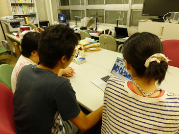 開発中のシミュレーションゲーム教材を体験する大学院生