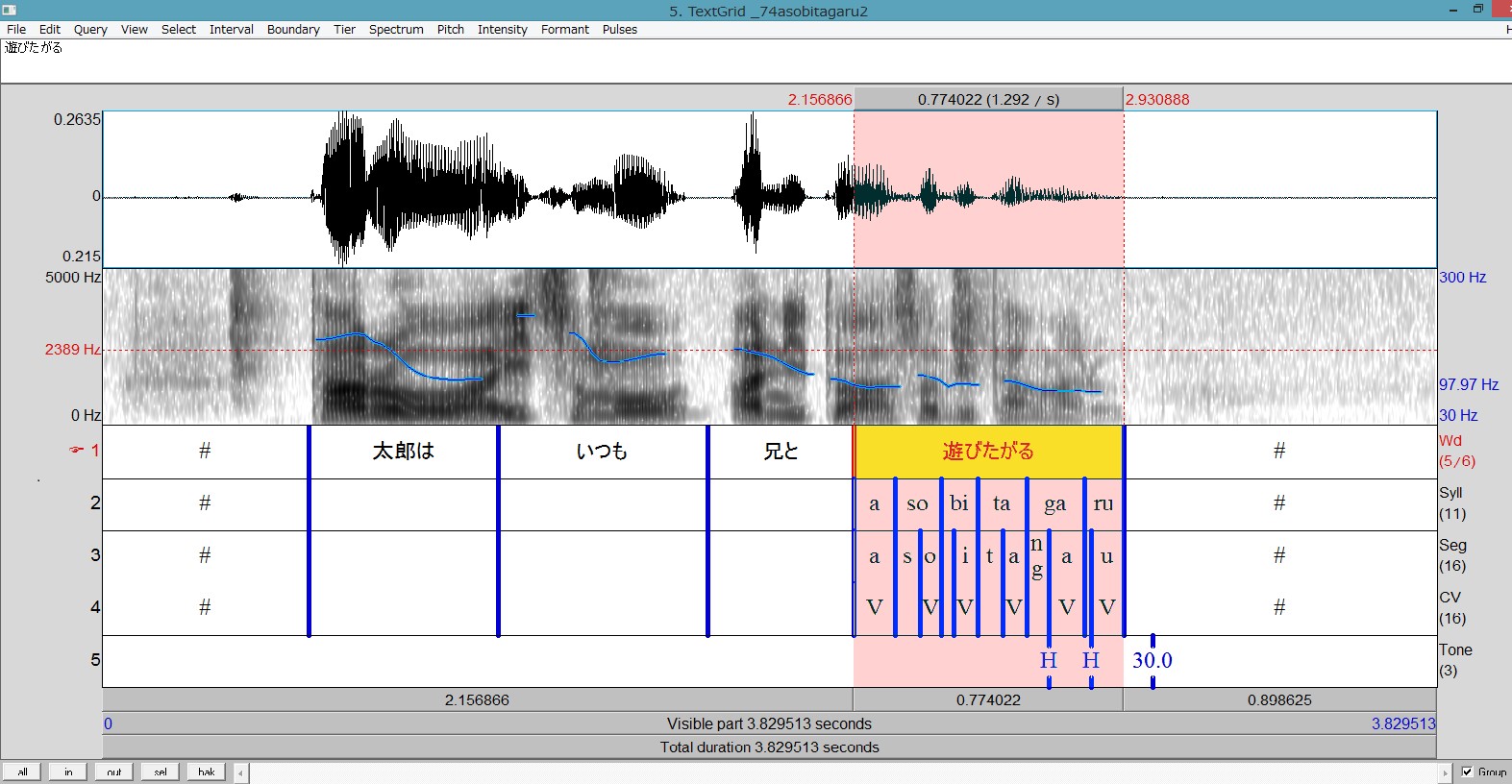 この図では、「遊びたがる」の部分の発音が平坦という特徴がみられる。