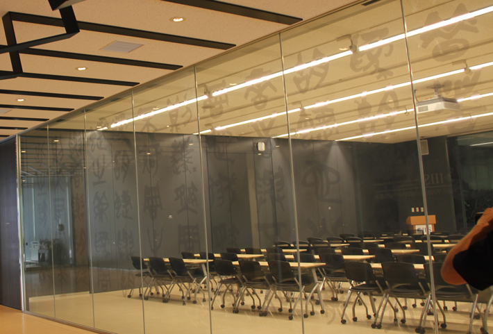睡眠医科学研究棟ロビーのガラス壁面一面にほどこされた篆書体
