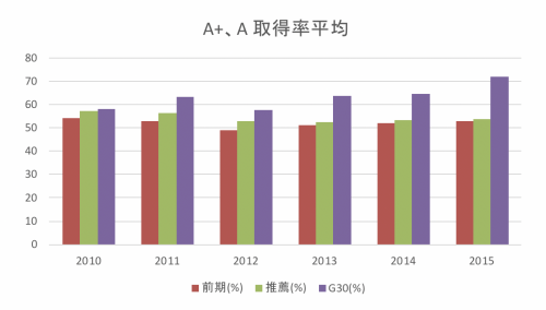 図 G30入学者、前期個別学力検査(一般入試)入学者、推薦入試入学者の、入学年度ごとの成績評価。A+とA 評価の取得割合(%)を示している。