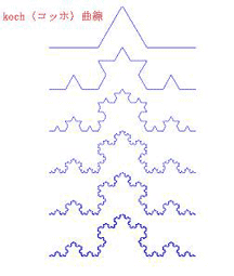 図形の一部を取って拡大すると、もとと同じ図形(すぐ上の図形)になる性質をもつ図形をフラクタル図形(コッホ曲線)と呼ぶ。データの変動の仕方(曲線)にもフラクタルな性質があれば、「短期間 の実測値」の性質を拡大し延長することで「長期後の予測」が行える可能性がある。
