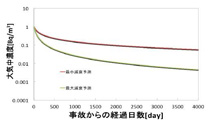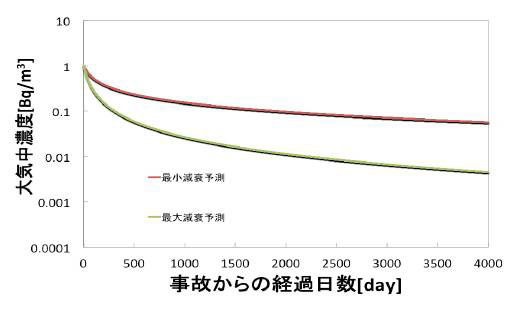 フラクタル理論を仮定し、初期のセシウム137の大気中濃度を1としたときの最大減衰(緑の曲線)と最小減衰(赤の曲線)の予測。減衰の早さの最大・最小は、チェルノブイリの実測値からの推測値を用いている。