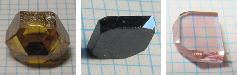 (左)高圧高温法ダイヤモンド結晶:炭素原子を置き換える形の不純物窒素原子を高濃度(百数十ppm程度)に含むので黄色を示す。