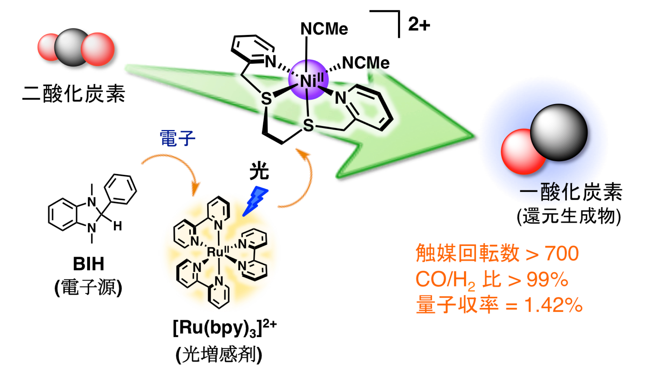 光エネルギーを化学エネルギーへと変換する人工光合成システムの実現は、深刻化する環境・エネルギー問題の解決や持続可能な社会の構築に向けた喫緊の重要課題として注目されています。本研究チームは、自然界に存在する酵素の活性中心をモデル化したニッケル錯体を触媒に用いて、高効率かつ高選択的にCO2からCOへ光触媒的に変換することに成功しました。