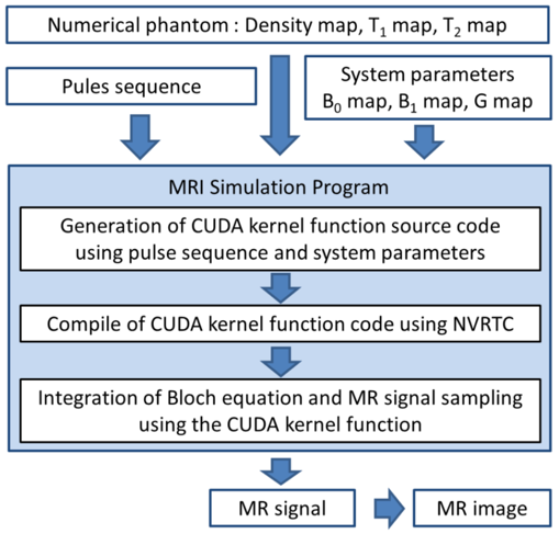 図 ? 開発したMRIシミュレータの構造。撮像実験に使用したパルスシーケンスをそのままシミュレーションに使用できる構造を有している(世界初)。数値ファントム(人体の構造をモデル化し数学的に表したもの)、パルスシーケンス、システムパラメタを入力すると、MRIシミュレータが、自動的にGPUのソースコードを生成して実行し、MRI信号を作成する。GPUのプログラムは、CUDAと呼ばれる専用のコードで記述されている。
