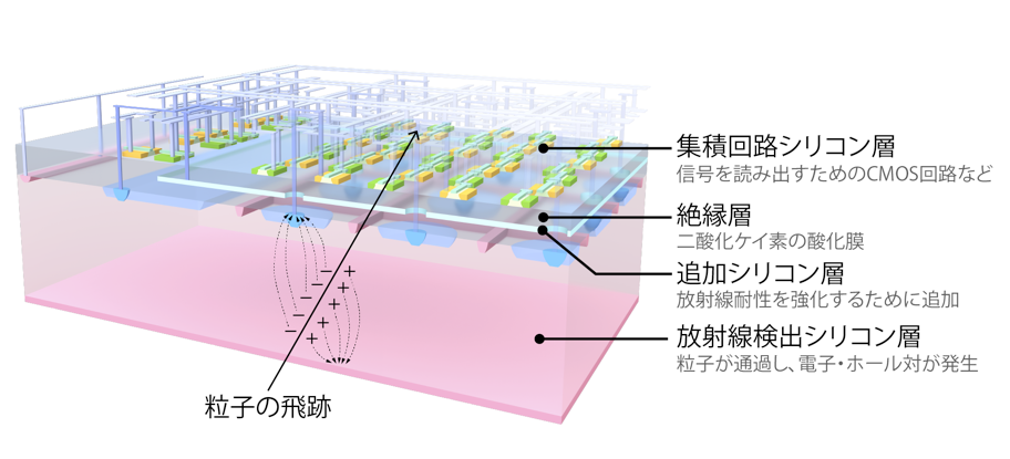 図 SOIピクセルセンサーの断面図。SOI構造下部のシリコン層は集積回路から絶縁されており素粒子センサーとして利用できる。センサーからの電気信号を基板上部の集積回路に直接伝えることで損失や雑音の少ないシステムを実現。集積回路は現代のエレクトロニクスを支える高度な技術で、センサーの信号処理にはうってつけの組み合わせ。こうしたセンサーと信号処理回路が一体となった構造は「モノリシック・ピクセル」と呼ばれる。今回開発したセンサーは放射耐性を強化するため、通常のSOI構造に加え、中間にさらにもう1層のシリコン層を加えている。(画像提供 Rey.Hori)