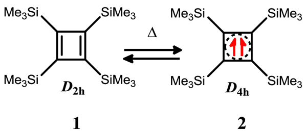 4個の炭素が環状になっているシクロブタジエンは反芳香族化合物で、極めて反応性が高く、長方形の構造(一重項状態)が最も安定であることが知られていますが、理論上は正方形構造(三重項状態)のものも存在することが予測されています。本研究では、シクロブタジエンにケイ素置換基を導入することで安定化させ、その正方形構造を電子スピン共鳴スペクトルで観測しました。これにより、1930年代から提案されてきた理論的予測を世界で初めて実験的に証明しました。