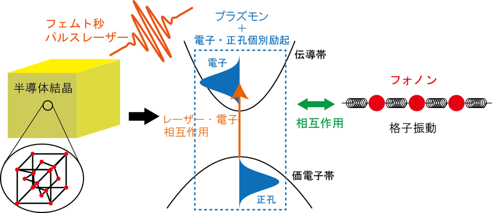 図 当該系量子ダイナミックスにおける相互作用の模式図。フェムト秒パルスレーザーを半導体結晶に照射することで、レーザー・電子相互作用によって電子系(プラズモン、電子・正孔個別励起)が誘起される。さらに、誘起された電子系がフォノン(格子振動)と相互作用することによって、コヒーレントフォノンが励起される。