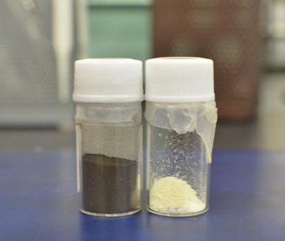 原料の二ホウ化マグネシウム(左)と生成されたホウ化水素(右)
