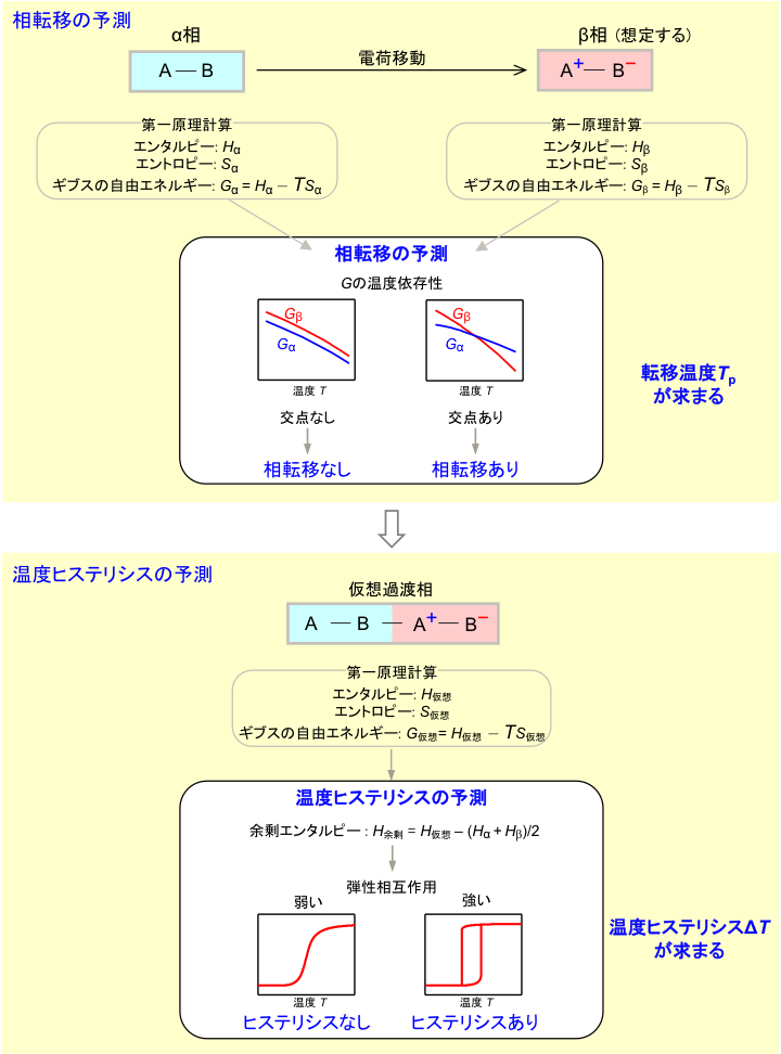 図 相転移を予測するための方法論を示すフローチャート(上)と温度ヒステリシスを予測するための方法論を示すフローチャート(下)。(上図)相転移前後の2つの相をα相とβ相として、α相とβ相の間の電荷移動相転移を予測する。(下図)α相とβ相の中間相を仮想に(-A-B-A+-B--)と設定し、この相がもつ余剰生成エンタルピーから内部圧力を求め、これを統計熱力学理論式に組み込むことで、温度ヒステリシスを予測する。