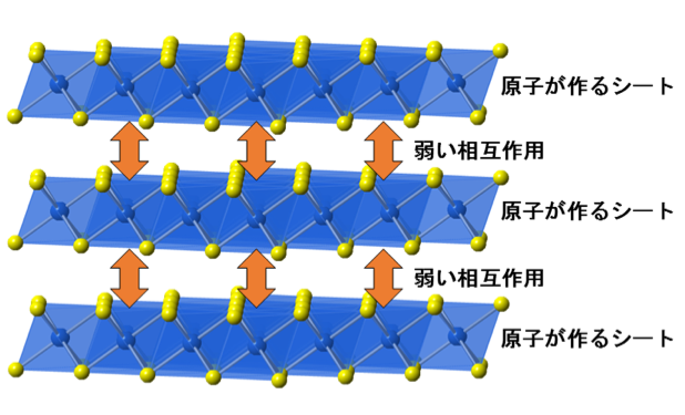 図 層状物質TiS2の構造。青丸はTi、黄丸はSを表す。これらの原子からなるシートが、相互作用によって積み重なっている。