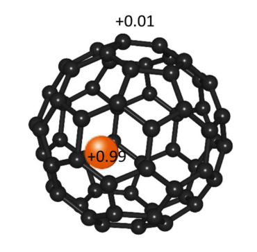 図 Li+@C60分子の電子状態(赤丸がリチウムイオン。数値は電荷を示す。)