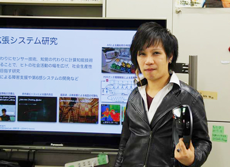 拡張現実の応用を研究している善甫さんは、それをさらに広げて知能拡張システムと呼んでいます。善甫さんの喩えによれば、それはオリンピック選手もパラリンピック選手もサイボーグも実質的に同じ土俵に乗せてしまうシステムなのだそうです。個人の限られた能力や障害をテクノロジーで補完すれば、可能性が広がります。たとえば、聴覚障害をもつ人に、相手の話し言葉を瞬時に文字情報に変えて、頭部に装着する特殊なゴーグル、ヘッドマウントディスプレイ上に映し出す。あるいは視覚障害をもつ人には、立体音響と超音波を用いて、聴覚で地図情報を提供する。立体音響というのは音源の位置を錯覚させる技術です。これを使えば、駅の改札やトイレの場所の位置すべてにスピーカーを設置しなくても、少数の超指向性スピーカーを制御することで、必要な人だけに必要な全方位情報を提供できます。音源の位置を錯覚させてだます技術という言い方もできそうです。
