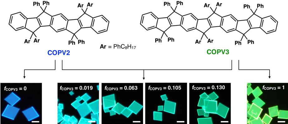 図 COPV2とCOPV3の分子構造、およびそれぞれの分子もしくは両分子を混合した溶液から形成したマイクロ結晶の蛍光顕微鏡写真。写真内の数値(fCOPV3)はCOPV3の混合割合を表す。スケールバー:10 μm.