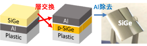 図 層交換法の模式図(左)と、今回形成したプラスチック基板上SiGe膜の写真(右)