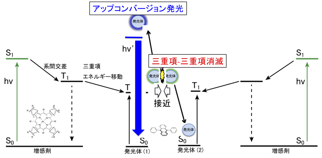 図 三重項--三重項消滅を利用した光アッフ?コンハ?ーシ?ョンの素過程。(1) 重原子を含む増感剤か?太陽光エネルキ?ー()を吸収し、基底状態から励起一重項状態となる(S0→S1)。その後、項間交差によって S1 から励起三重項状態へとほほ? 100%の収率て?変換される(S1→T1)。(2) T1 状態になった増感剤から発光体へ三重項-三重項エネルキ?ー移動か?起こり、増感剤は S0 状態、発光体は T1 状態になる。(3)同様の過程によって T1 状態になった発光体同士か?拡散・衝突すると三重項--三重項消滅か?起こり、一方は S1 状態、もう一方は S0 状態となる。(4) S1 状態となった発光体から蛍光か?発する(S1→S0+h/′)。このときの光の波長は初期に吸収した光の波長よりも短い( > ′)。つまり、エネルキ?ーの低い長波長の光を吸収し、エネルキ?ーの高い短波長の光を発光することとなる。