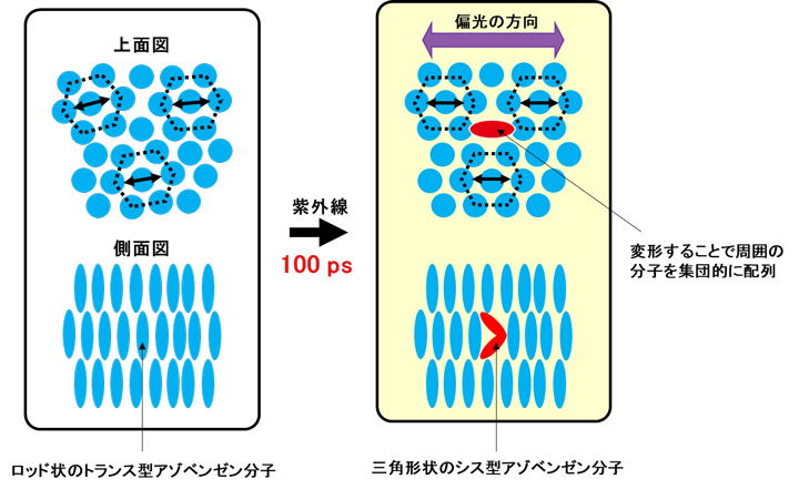 筑波大学エネルギー物質科学研究センターの羽田真毅准教授と東京大学大学院工学系研究科の山口大輔大学院生、加藤隆史教授らは、液晶の中にあるアゾベンゼンの分子が、光を照射されると瞬時(100億分の1秒)に集団的に運動する現象を初めて観測することに成功しました。
