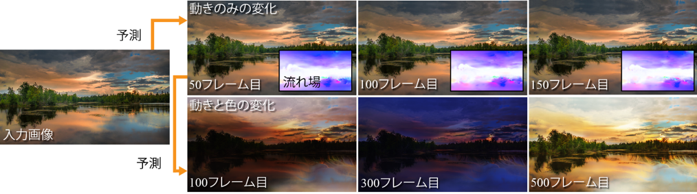 動画は画像と比べてはるかに複雑な情報を含むことから、AI による動画の理解・生成は画像以上に難しい問題として、数多くの研究者によって取り組まれてきました。本研究では、雲や水面などを含む景観においては、雲のような細かい動きは時々刻々と変化するのに対し、夕焼けや日没などによる色の変化は全体的かつゆっくりと変化する、ということに着目しました。これらの違いを扱うため、細かい動きと全体的な色の変化を扱うニューラルネットワークを別々に学習させます。 今回開発した技術により、インターネット上の景観画像から手軽に、従来技術よりも高品質な時間経過の動画を生成できるようになります。本技術は、エンターテイメント用途に加え、景観予測シミュレーションなどへの応用も期待されます。