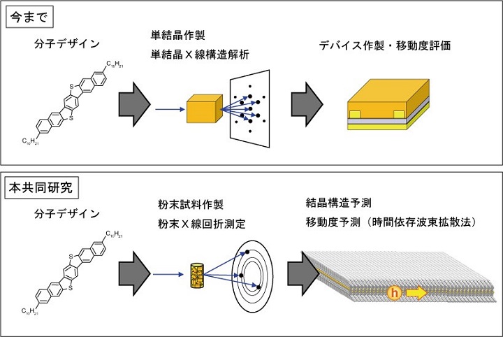 今回、共同研究グループは分子の化学構造式と粉末X線回折パターンから単結晶構造と材料特性(移動度など)を短期間で予測するシミュレーション法を開発しました。また、このシミュレーション法を高性能な有機半導体分子に適用し、その有用性を実証しました。