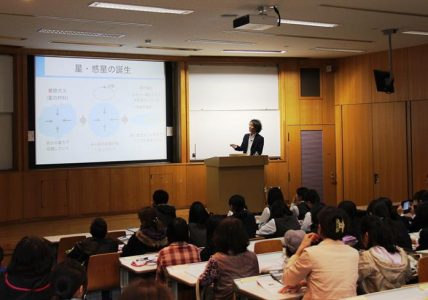 いつも大学生が講義を受けている階段教室で,本学の教員が授業を行いました。何年も前のオリンピックでとったメダルが取り消されたというニュースをときどき聞きます。禁止されていた薬物が後で見つかったというドーピング違反がその理由です。そのドーピングってなんなのでしょう。ロンドンオリンピック柔道の銀メダリスト平岡拓晃さんも交えてトークが盛り上がりました。南極と宇宙,どこで結びつくのでしょう。地球上でいちばん乾燥している場所が南極の高地で,そこだといろいろな電波が観察できるという話に,みなさん納得しました。南極望遠鏡建設の夢が早く実現するといいですね。