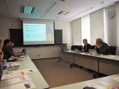 物質・情報系グループは,学際物質科学研究センター(TIMS)において,鍋島達弥センター長をはじめとする研究者と意見交換を行いました。計算科学研究センターでは,本学のスーパーコンピューターに関する研究紹介及び矢花一浩教授,亀田能成教授が研究を紹介しました。