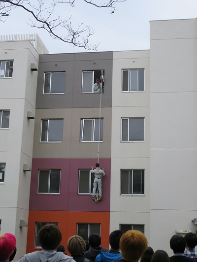 5月17日,平砂学生宿舎共用棟前で学生宿舎初期消火訓練を実施し,留学生を含む多くの入居者が参加しました。訓練では,つくば市中央消防署の指導による消火器を使用した初期消火訓練,設備メーカによる避難ハシゴ・緩降機の使用方法の説明,避難実演が行われました。
