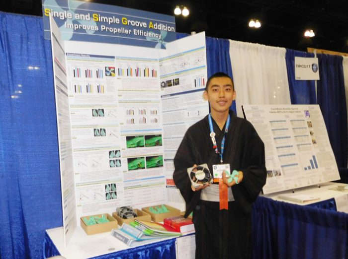 筑波大学GFESTは,全国の中・高校生を対象に,科学研究に対する強い関心と熱意,自主的探究能力と科学的思考力を持ち,高度で挑戦的な課題の発見と解決をめざす未来の科学者の育成を目標としたプロジェクトです。受講生1名に本学の教員1名と大学院生1名の計2名が専属で指導にあたります。田渕さんは,筑波大学GFESTの受講生として数理物質系吉田恭助教の指導の下,4年間にわたり,ファンプロペラの効率を上げる方法について研究してきました。その過程で,プロペラの羽の表面に細い溝をつけることで,プロペラが生み出す風量がかわるのではないかという仮説を立て,様々な可視化実験を試み,その効果を実証しました。今回のISEF2017では,その研究データをまとめ,「Single and Simple Groove Addition Improves Propeller Efficiency(一つのシンプルな溝の加工がプロペラの効率を上げる)」というテーマで発表を行い,その研究成果が高く評価されました。
