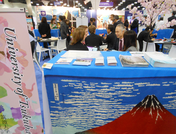 また,NAFSAでは毎年,JAFSA(Japan Network for International Education)主催による日本留学フェア(Study in Japan)が開催されています。今年度は本学から国際室教員とグローバル・スタッフ育成室海外短期派遣研修生として2名の事務職員が参加しました。日本留学フェアは大変盛況で,本学ブースには,アメリカや中国・韓国のほか,学生の海外派遣に力を入れ始めたインドや,トルコやチェコスロバキア,そしてイタリアなど,様々な国・地域から多数の教育機関関係者が訪れました。このうち,アメリカの教育機関からは語学研修プログラムの提供について,本学との新たな交流を希望する機関からは,協定締結の可能性についての問い合わせが数多くありました。