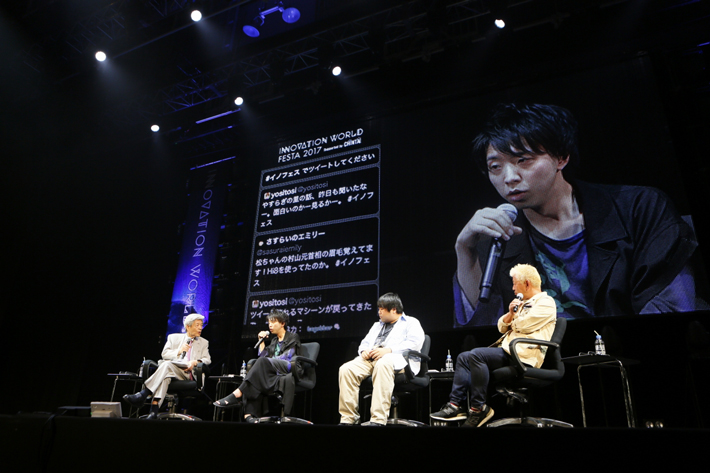 田原総一朗,落合陽一(メディアアーティスト/本学助教),中川悠介(ASOBISYSTEM代表),土屋敏男(日本テレビ放送網株式会社/日テレラボシニアクリエイター)によるトークセッション。2020年に向けて日本のエンターテイメントやテクノロジーを世界にどう発信していくか。これからの日本に必要なものは何かについてトークが展開された。