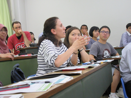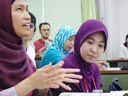 (熱心に質問する留学生)