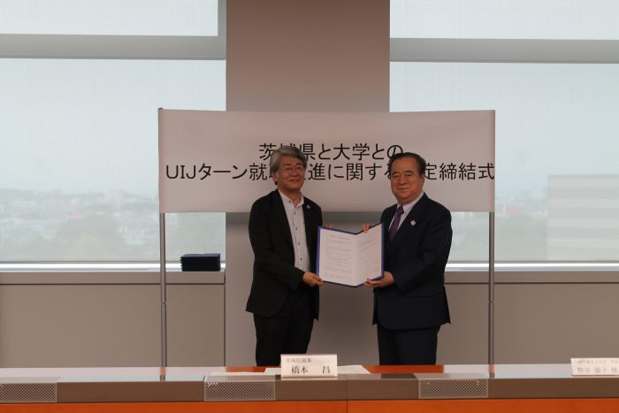 (協定書を取り交わす五十嵐大学執行役員と橋本昌茨城県知事)[/caption] 7月25日,茨城県庁において,筑波大学と茨城県は,就職促進に関する協定を締結しました。本学から五十嵐浩也大学執行役員(DACセンター担当)が出席しました。 本学は,これまでも「大好きいばらき就職応援"くらぶ"」に加盟し,茨城県及び産業界等と相互に連携・協力し,学生の茨城県へのUIJターンと就職・定着の支援を行ってきました。