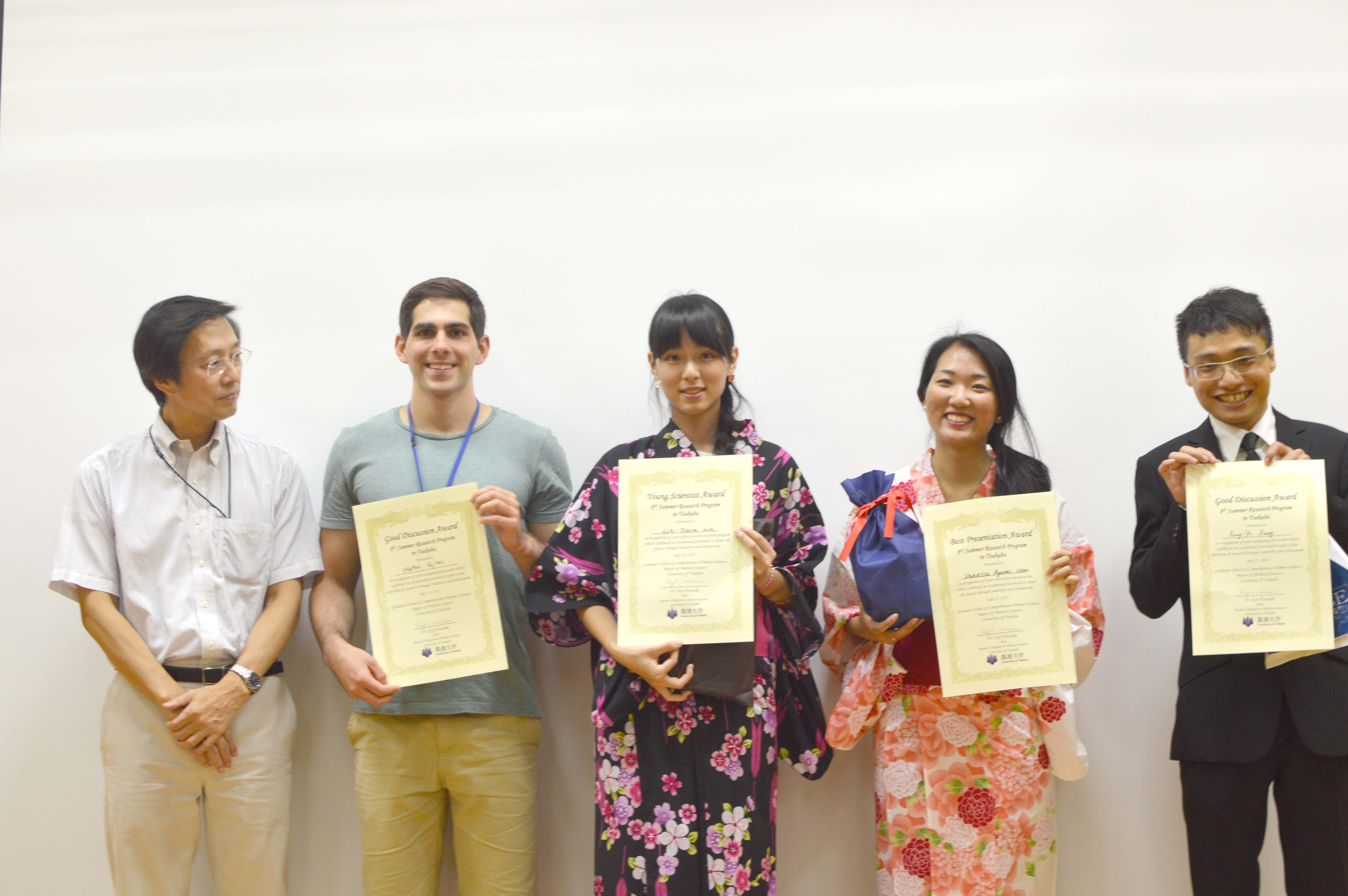 また,医学医療系の柳沢正史教授や生命環境系の江面浩教授による科学セミナーや人文社会系の小野正樹教授による日本語や日本文化に関するセミナーを受講し,最先端科学および日本文化について学びました。週末には本学学生との交流会を行い,筑波山への登山や餅つき,流しそうめん等を体験しました。最終日には,2週間の期間中に得られた研究成果の発表会を行い,優秀な発表には以下の賞が与えられました。