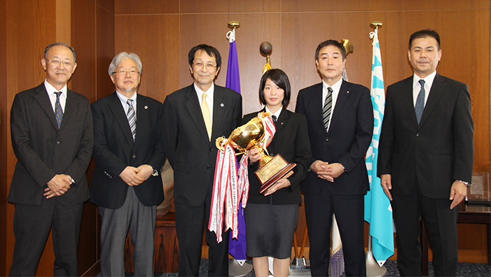 この成績を報告するため,8月22日に大西ななみ選手が,香田郡秀剣道部部長,有田祐二剣道部女子監督とともに,永田恭介学長及び玉川信一副学長,清水諭副学長を表敬訪問しました。大西選手,剣道部部長及び監督から,今大会の様子や今までの成績等について説明があり,終始和やかな雰囲気で懇談しました。最後には,学長及び副学長から,素晴らしい成績を収めたことへの労いと今後の活躍を期待する言葉がありました。