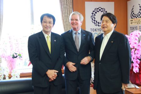 (林文部科学大臣 表敬訪問の様子。写真右から,林文部科学大臣,エマート会長,永田恭介学長)