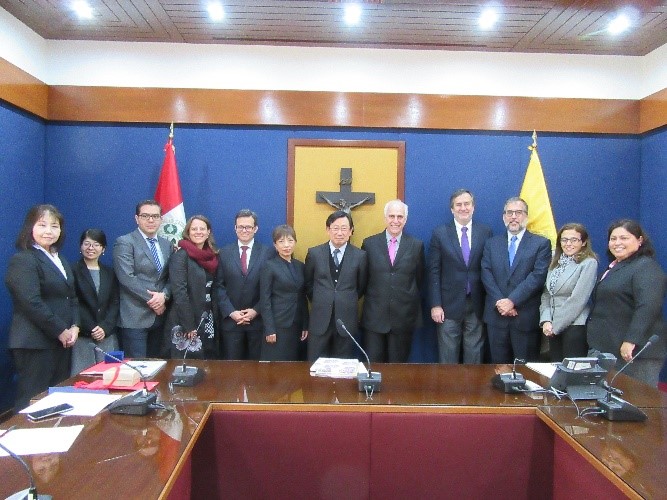 (Marcial Rubioカトリカ大学長(右から5番目)を表敬訪問する遅野井委員長(同6番目)他委員会一行)