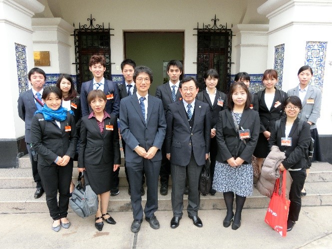 (遅野井委員長(前列右から3番目)が短期研修派遣プログラム参加学生と在ペルー日本国大使館・高木昌弘公使参事官(同4番目)を表敬訪問)