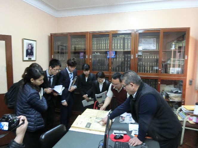 (研修先のペルー新報社で説明を受けるプログラム参加学生)