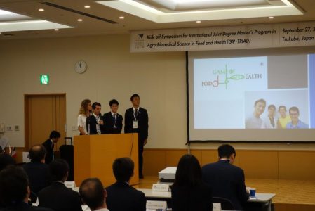 そして,9月27日にはTGSW2017 Campus in Campusジョイントセッションである「国際連携食料健康科学専攻発足シンポジウム: Kick-off Symposium for International Joint Degree Master's Program in Agro-Biomedical Science in Food and Health]において,本専攻発足の記念式典が行われ,3大学の代表(本学永田恭介学長,国立台湾大学Tei-Wei Kuo副学長,ボルドー大学Vincent Dousset副学長)より祝辞を賜りました。その後,熊谷嘉人専攻長より本専攻概要の紹介,3大学の本専攻担当教員(本学医学医療系の大庭良介准教授,国立台湾大学Tsai-Kun Li教授,ボルドー大学Dominique Rolin教授)による各大学における学修内容の紹介が行われました。学生セッションでは,各学生グループよる素晴しいプレゼンが行われ,会場の参加者から多くの質問が飛び交う活発なセッションとなり,今後の発展の可能性を大いに感じさせるものになりました。10月から本格的に始動する講義,特定課題研究をはじめとし,本専攻の特色を生かした今後の学生活動が大いに期待されます。